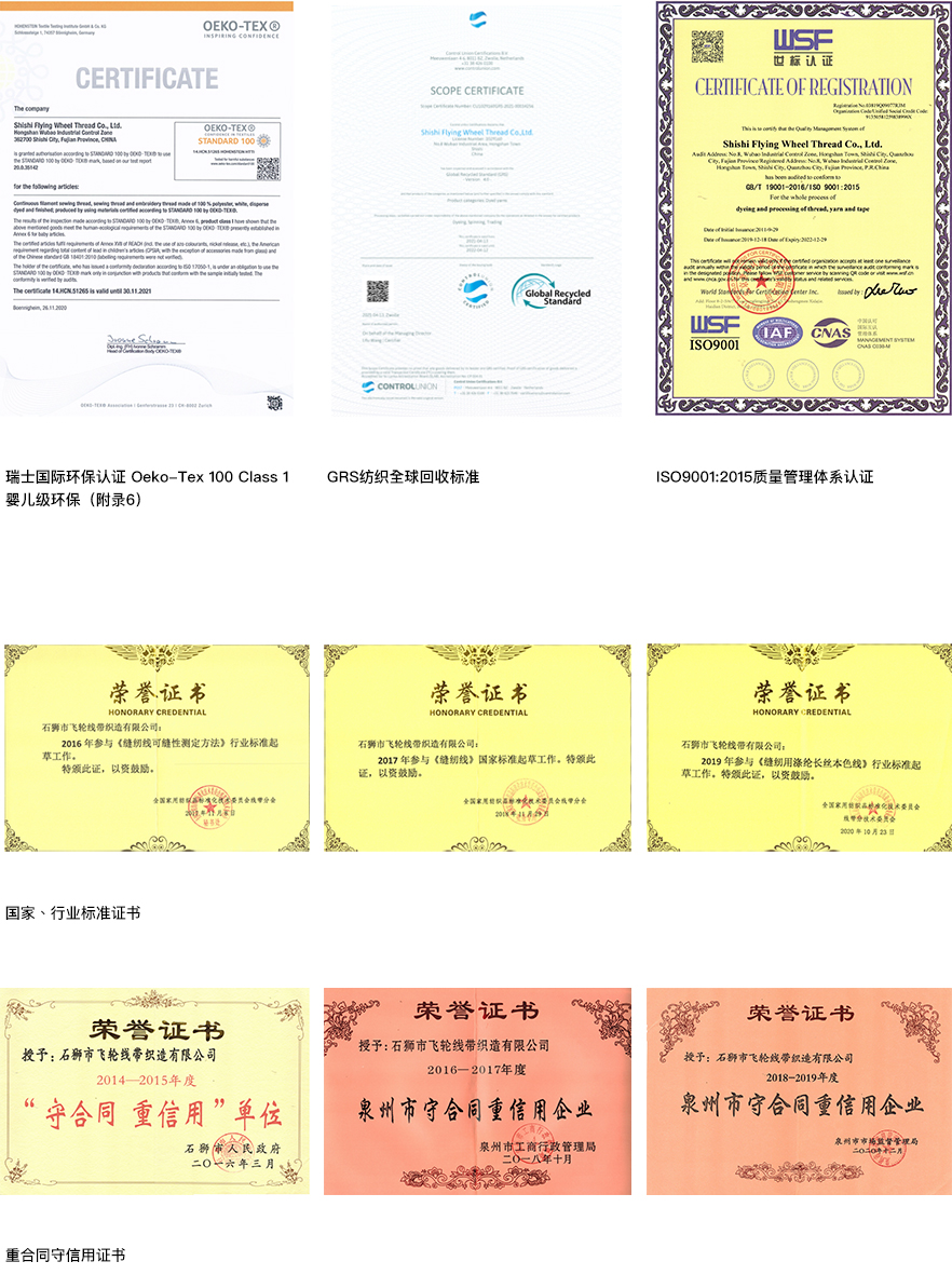 作為國內領先的縫紉線和繡花線生產廠家之一,公司是多項國家行業標準的起草單位、中國服裝協會服裝關聯產業專業委員會副主任委員單位及中國家用紡織品標準化技術委員會線帶技術委員會副主任委員單位,并且先后通過了ISO9001:2008質量管理體系認證、瑞士Oeko-Tex Standard 100信心紡織品I類(嬰幼兒級別)認證,和紡織全球回收標準GRS4.0認證。